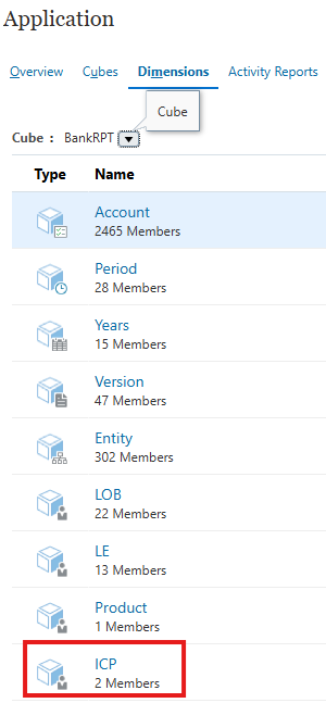 The intercompany (ICP) dimension has 13 members in total. In FS cube I can see all 13 members mapped in the cube. In BankRPT cube, even though I can see all 13 members mapped in the cube, I only see 2 members as available, and it hinders me from opening forms that include this dimension.