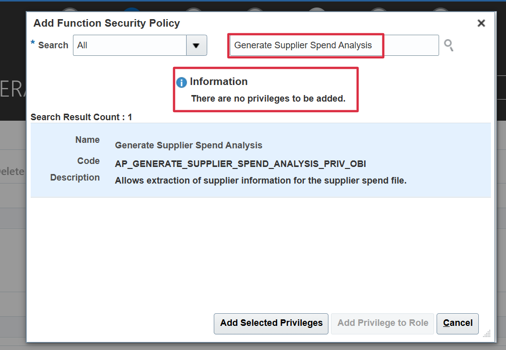 Generate Supplier Spend Analysis directly to user but not able to tried creating custom role and add at privilege level still not able to it shows below message.