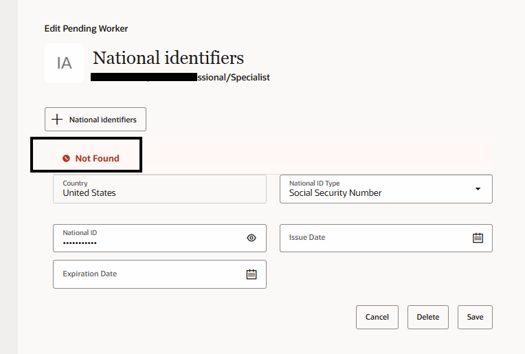 Unable to update national identifier in edit pending worker page. Getting below error in Redwood.