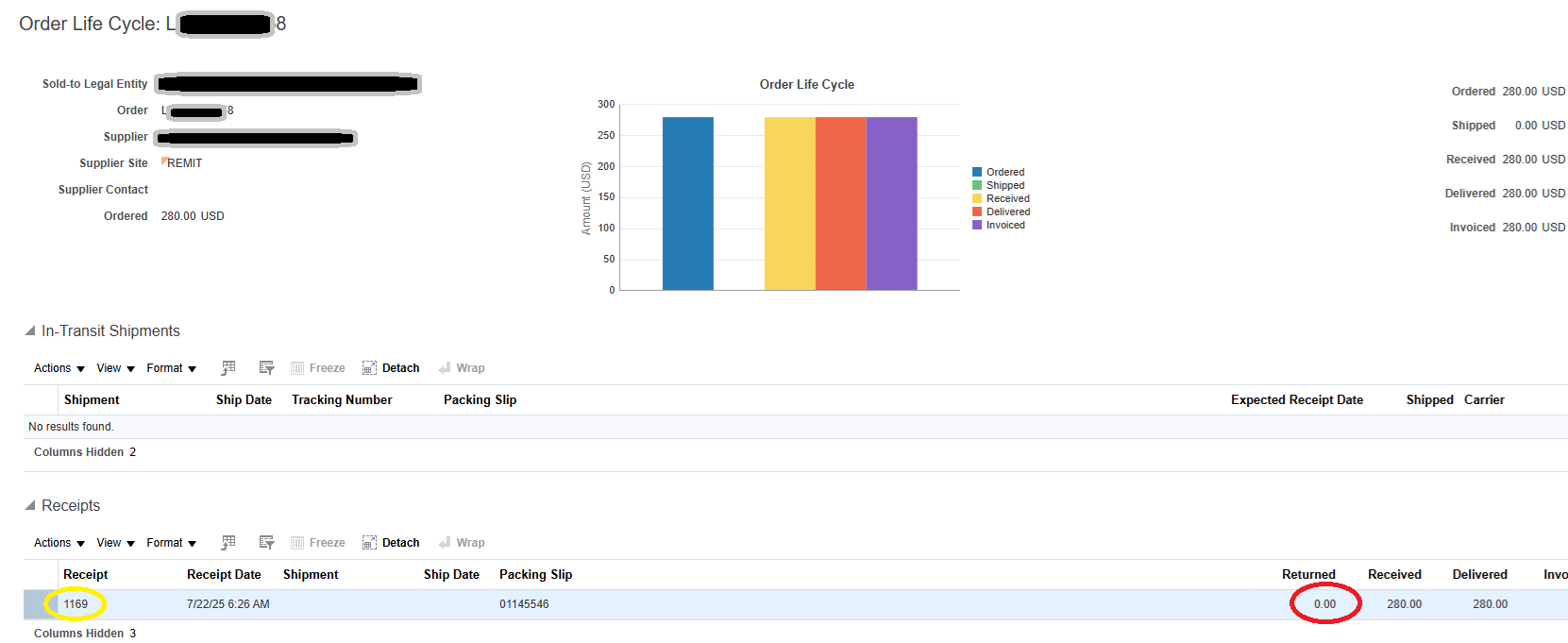 Return receipt was processed, shipment was created, the shipment was pick confirmed and ship confirmed, but there was no inventory transaction, and the receiving return has a status of 'pending fulfillment'. There was no inventory transaction created, and the purchase order does not show any returns, even though if I open the return, it clearly shows the purchase order information.