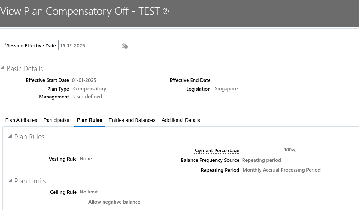 We’ve identified that the balance calculation end date for the Compensatory Off plan on the employee view is incorrect. Although the balance has been calculated through the end of the year, the system is currently displaying the balance as of today.
