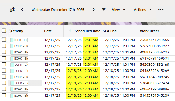We have some activities that are being scheduled with future date and defaulted with midnight by C2M. Below are the highlighted samples with 12/16/2025 12:00 AM, 12/17/2025 12:00AM and 12/18/2025 12:00AM. Note that Scheduled Date = SLA Start.