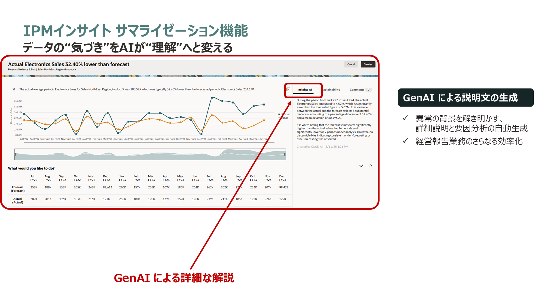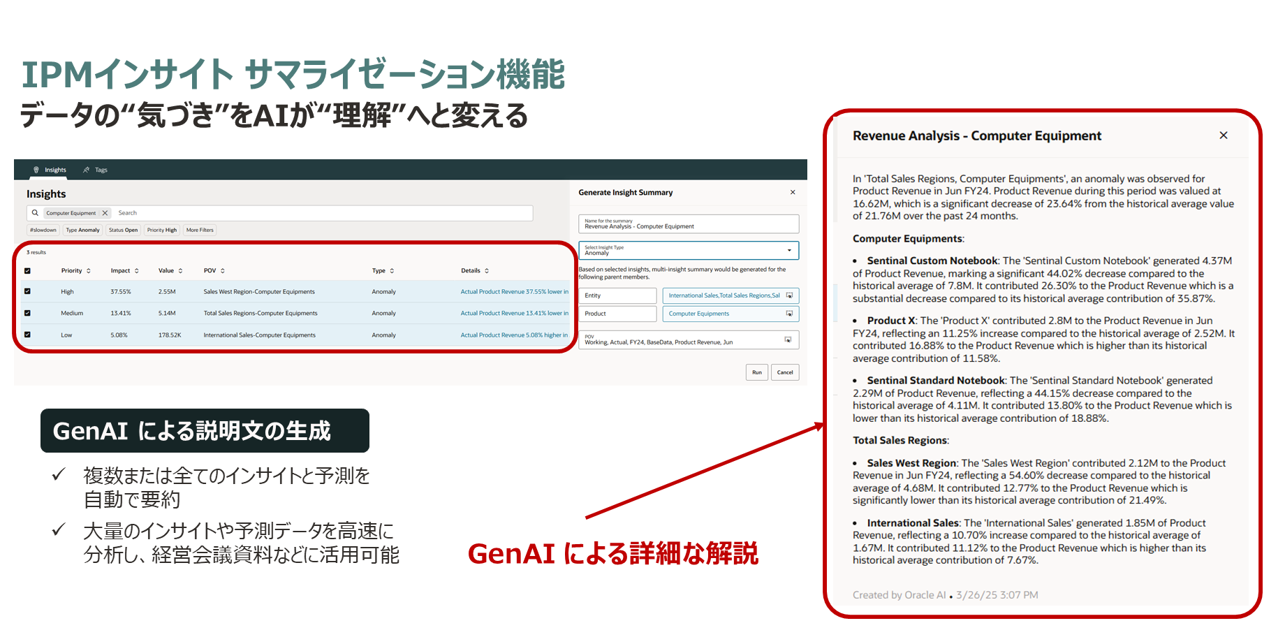 IPMインサイトとサマライゼーション機能の組み合わせにより、Oracle Cloud EPMでは、データの異常を検出するだけでなく、その背景や要因を自動で解き明かし、意味づけまで行うことが可能になりました。