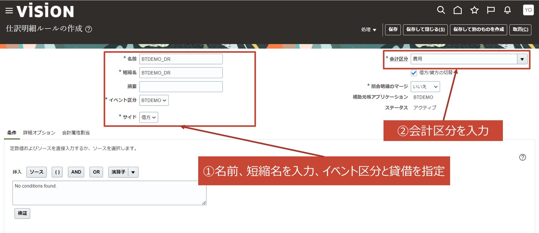 仕訳明細ルールは取引データから会計仕訳を自動生成するための明細レベルの定義です。取引属性に基づいて貸借や金額等を動的に決定いたします。補助元帳ルールセットは仕訳生成のための一連のルール群です。今回ですと、摘要ルール、勘定科目ルール、仕訳明細ルールを一つにまとめます。