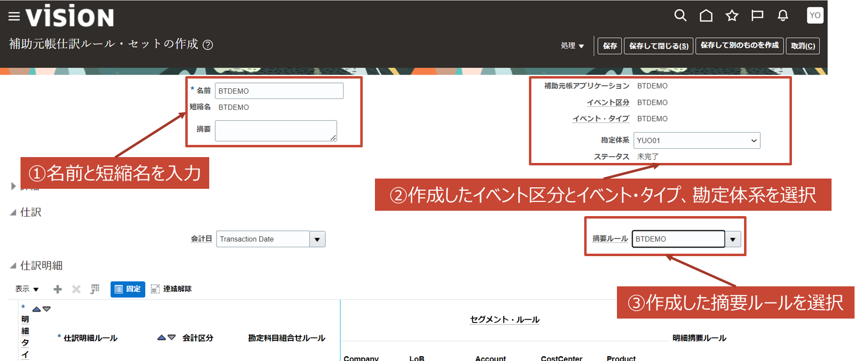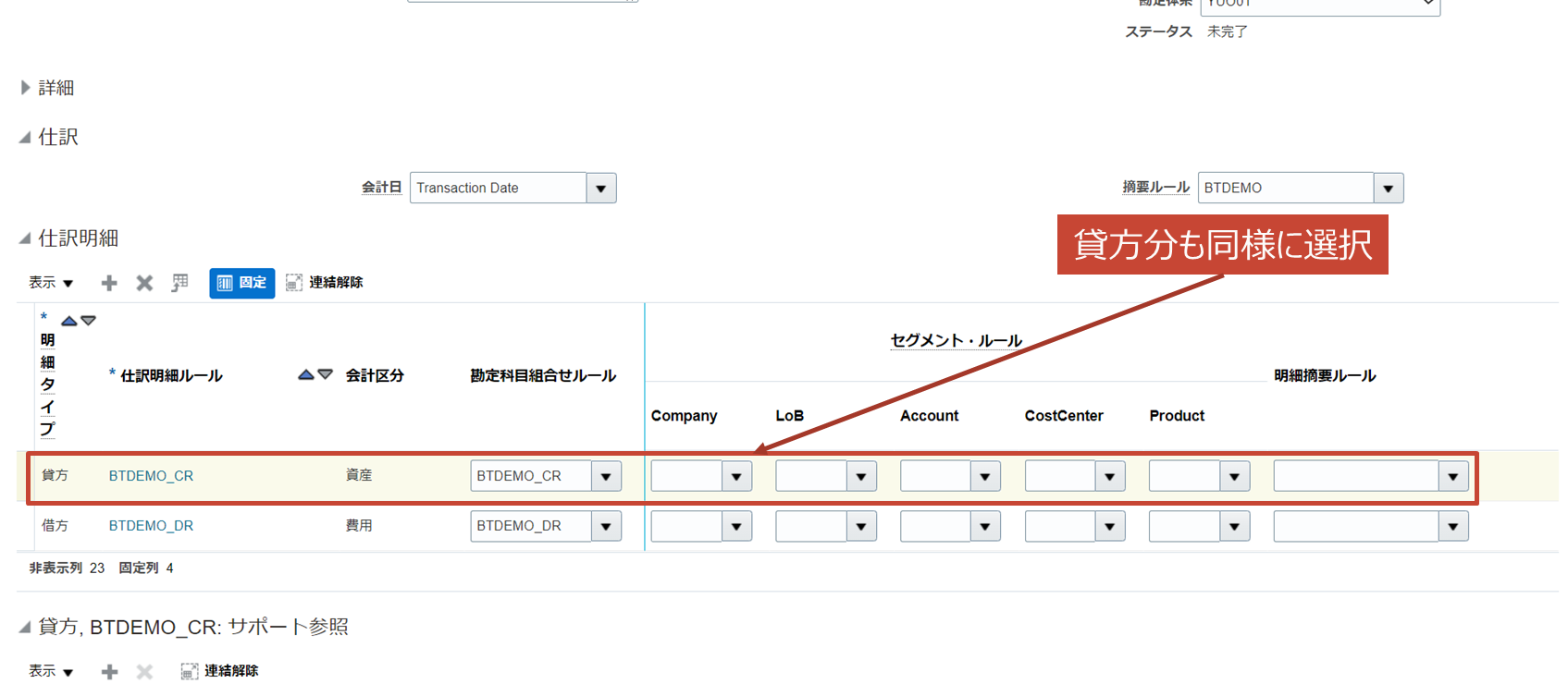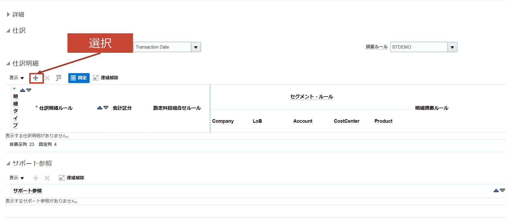 これまで作成してきたルールを仕訳の形に整えます。今回利用しなかったサポート参照等もこちらで割り当てが可能です。作成したルールには他の補助元帳ルール・セットにも利用可能です。そのため、新たにFAHを設定する際には、効率的に行える可能性があります。