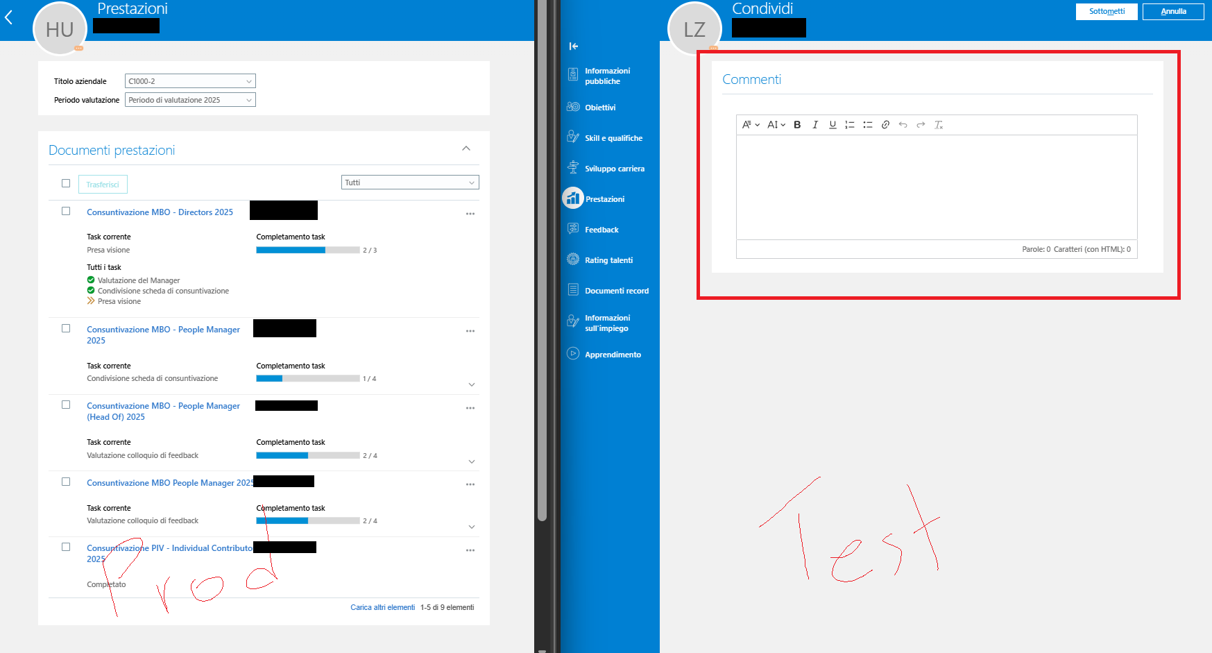We are facing an issue in the Production environment related to Performance. Specifically, when the manager is in the Share Performance Document task and clicks on the Share and Release button (Condividi), he is redirected back to the main Performance page instead of being redirected to the Comments page, as happens in the Test environment.