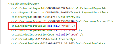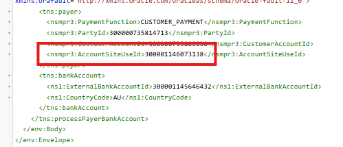 Intermittently the bank account is not assigned at the site level but to the customer account. This issue occurs intermittently, sometimes it works other times it doesn't. Assignment to the account level seems to be because the AccountSiteUseId is not being included in the create process as shown below.