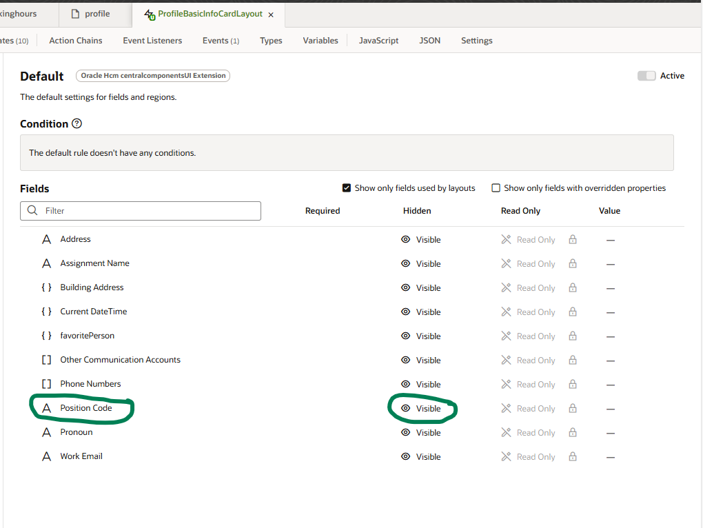 I’m facing an issue in Oracle Cloud HCM where the Position Code is not displaying on the Org Hierarchy (person-hierarchy) page, even though it has been exposed and set to visible in the following VBS forms: