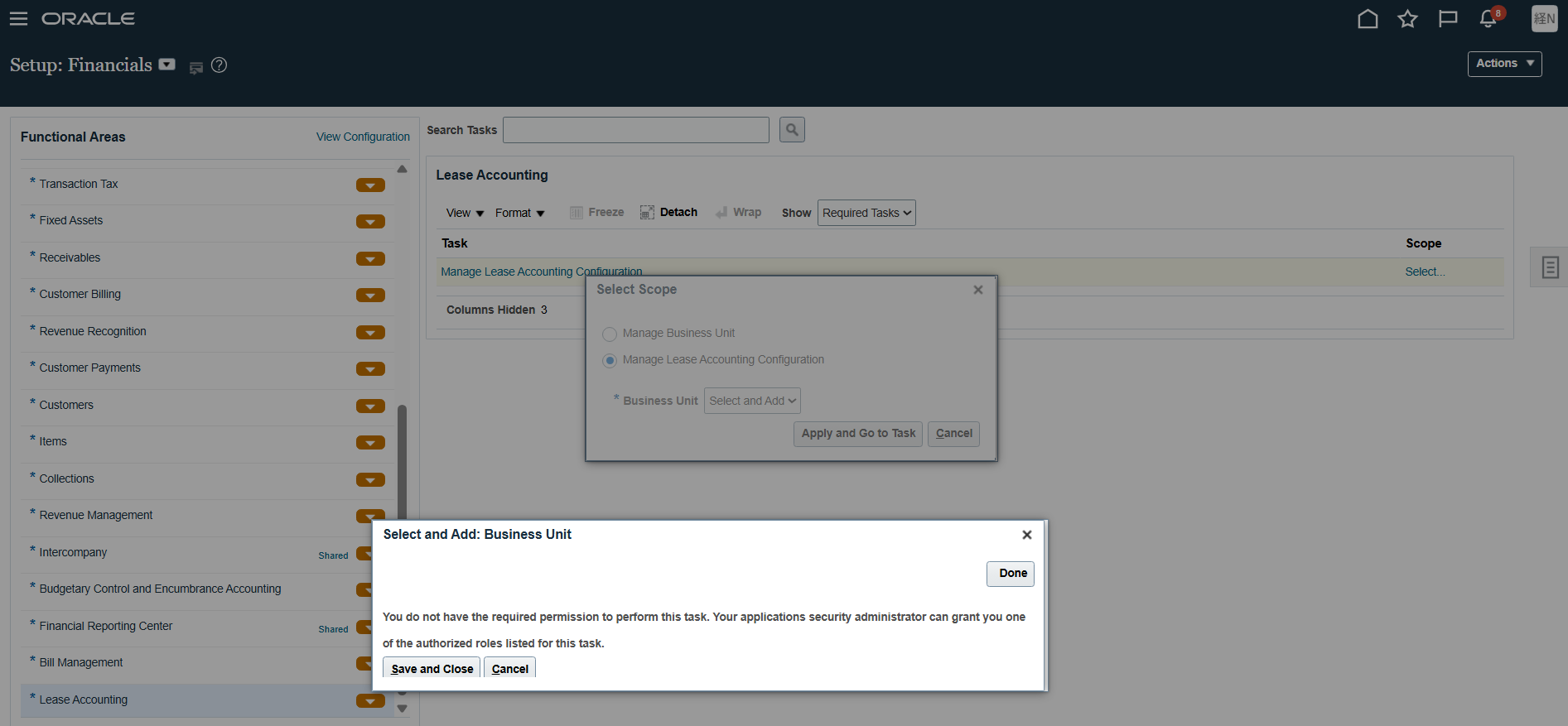 However, when the user which have this role access to Configuration Task"Manage Lease Accuonting Configuration", error occcurs.