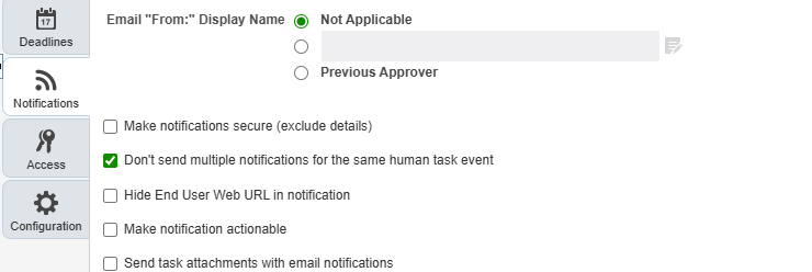 - TimecardApprovalELA > Notifications> Checked Don't send multiple notifications for the same human task event