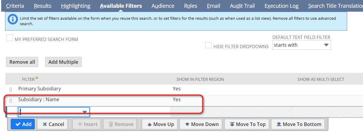 The second and more straightforward approach is to create the saved search on the “Customer–Subsidiary Relationship” record. This record represents the underlying mapping between customers and subsidiaries and returns one row per relationship, covering both primary and secondary subsidiaries automatically. As a result, it allows you to filter multiple subsidiaries easily and provides a more reliable dataset for reporting or exports.