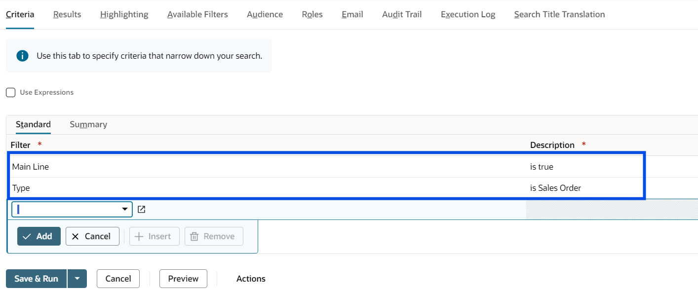 - Under Criteria subtab > Add filters to return only relevant records