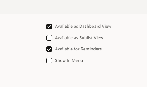 - If you will be using it for Dashboard View, Sublist View, or Reminders make sure to check this boxes:
