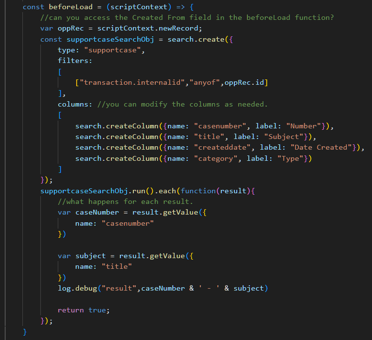 - You can access the Related Transactions for Opportunity records using N/search module to search for cases related to the transaction record. Here's a sample code that you can use as a reference: