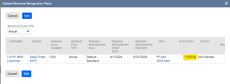 When the "Create And Maintain Revenue Element Upon Closed Order" setting is set to "False" during the creation of both the sales order and invoice, the Total Revenue Amount on the Revenue Arrangement page will be equal to the amount of the invoice.