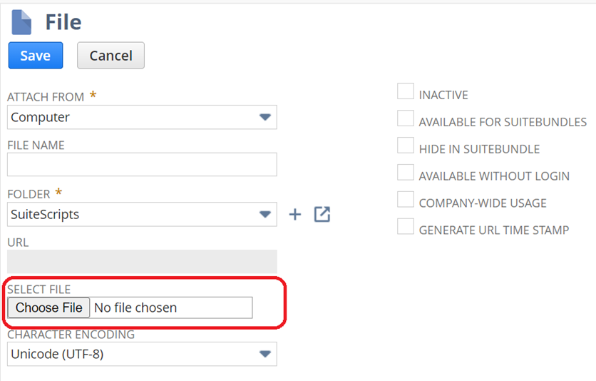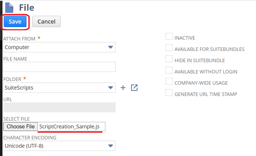 - SuiteScriptファイルはJavaScript(.js)ファイル形式である必要があります。