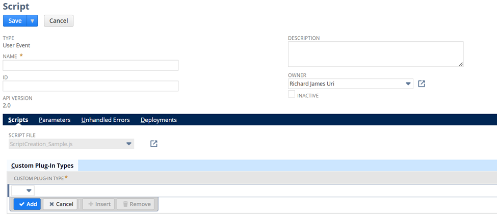 - 必要に応じて、スクリプトレコードの「オーナー」フィールドの値を変更します。デフォルトでは、このフィールドは現在ログインしているユーザーに設定されています。
