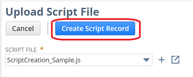 - SuiteScriptファイルがまだアップロードされていない場合は、「+」アイコンをクリックしてアップロードします。