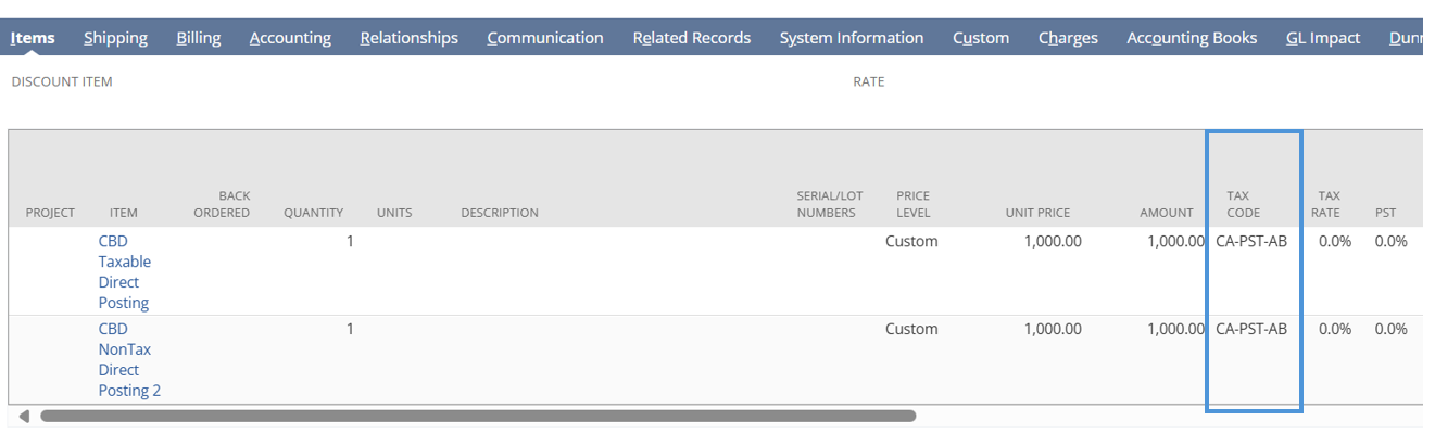 - 請求書トランザクションで、顧客(PST免税= False、税区分= null)を選択し、課税対象および非課税スケジュールの2つのアイテムを追加します。