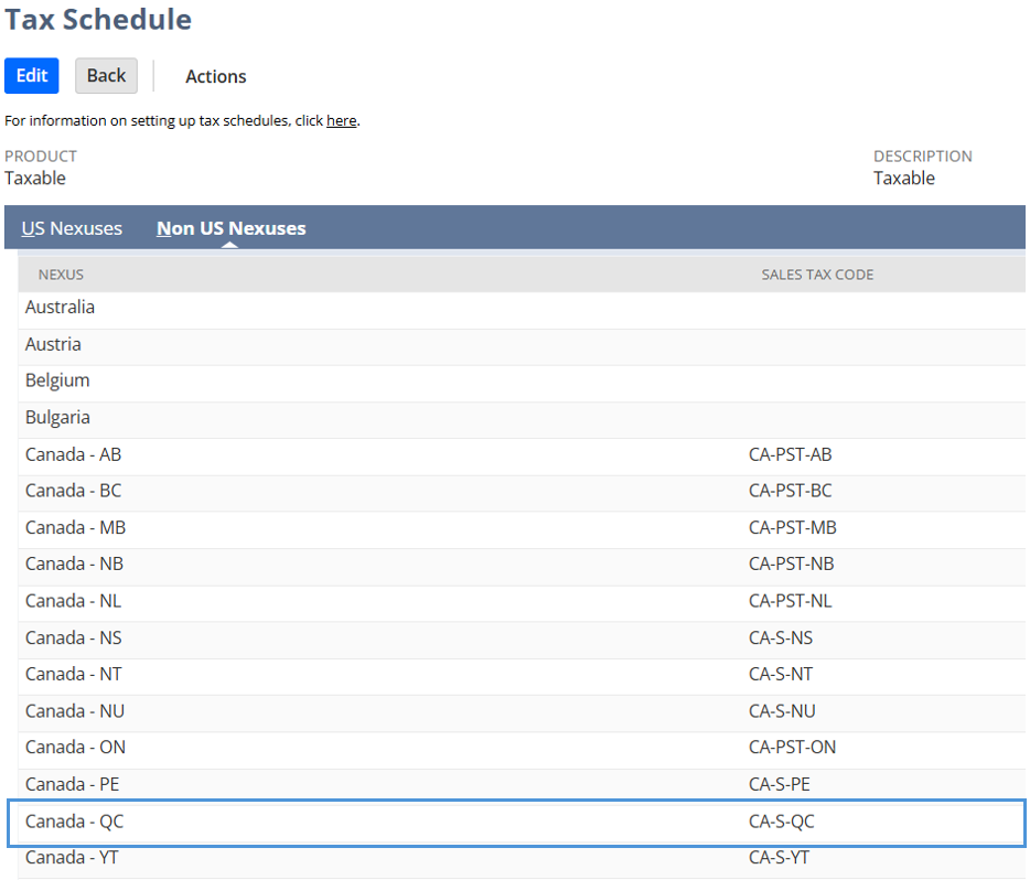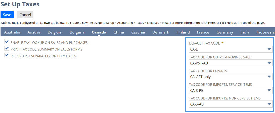 カナダNexusの「税金の設定」ページで、選択した税金コードは次のとおりです: