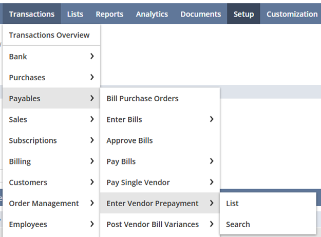 仕入先前払を入力するには、「トランザクション」>「買掛金」>「仕入先前払を入力」に移動します。