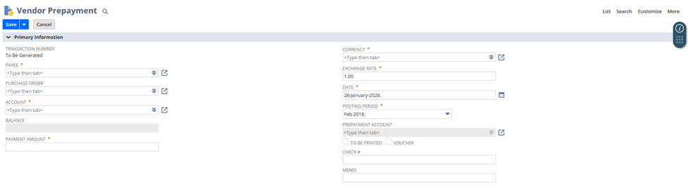 新しい仕入先前払を入力することで、仕入先への預入の提供を開始します。前払金が充当されると、トランザクションのステータスは支払済になります。前払金勘定が借方に記入されている間、銀行勘定またはクレジット・カード勘定が貸方に記入されます。