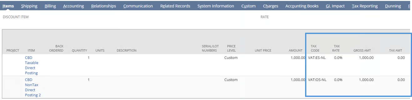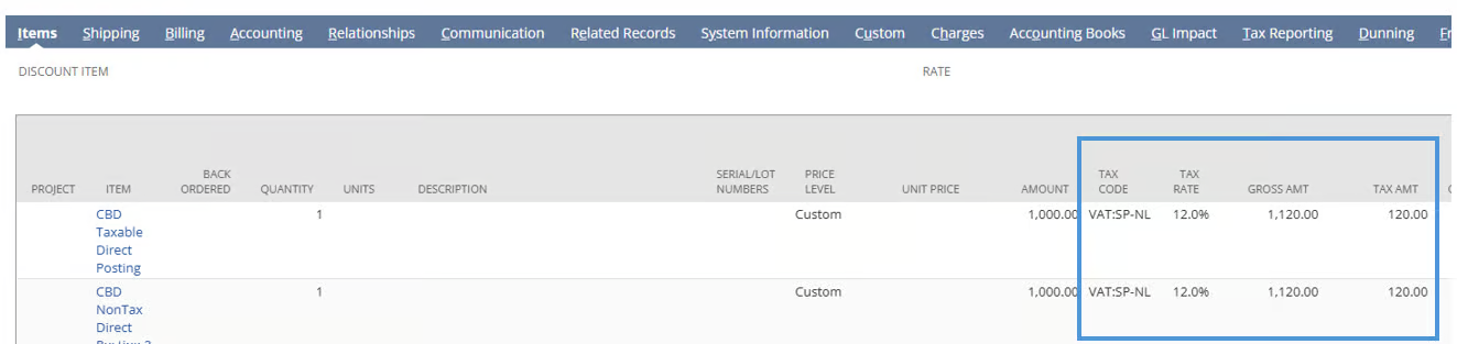 ご覧のとおり、課税対象アイテムと非課税アイテムの両方が、顧客レコード(「SP-NL」)で定義されている税アイテムを引き出します。
