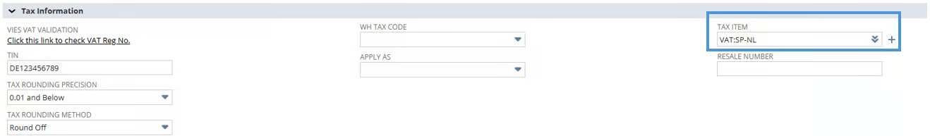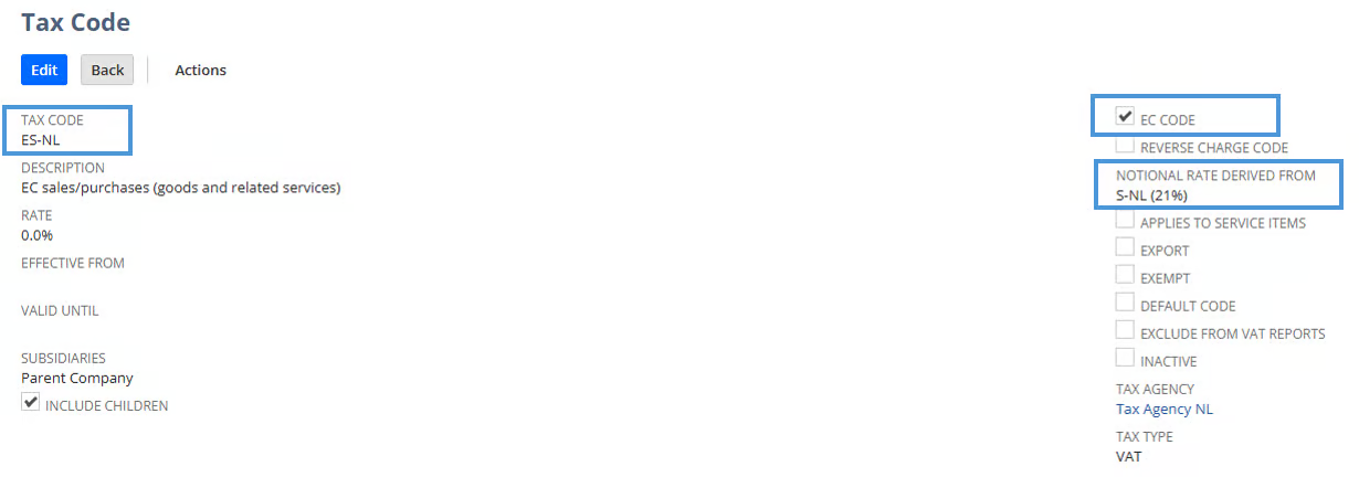 これらの基準が満たされた場合、NetSuiteは課税対象アイテムにこのECコード(例: "ES-NL")を使用します。