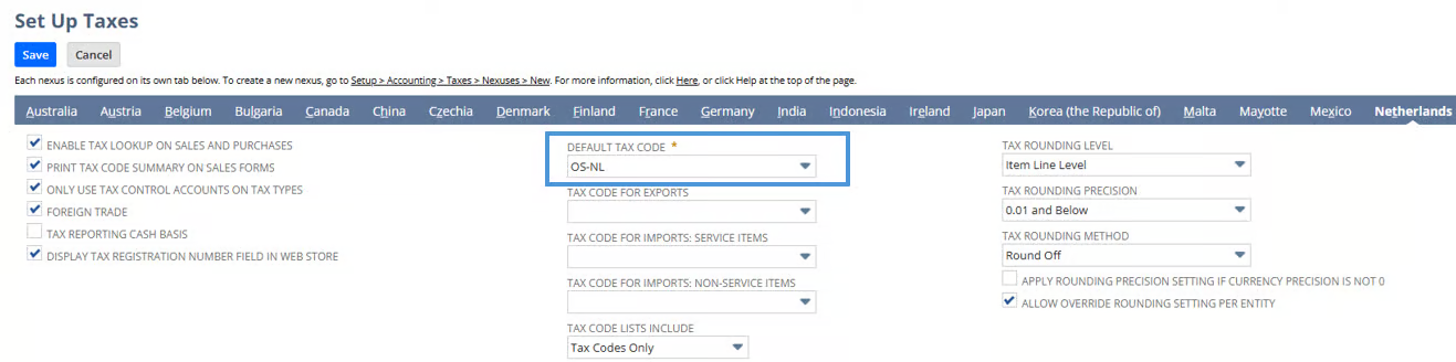 NetSuiteは、ネクサスに割り当てられたデフォルト税金コードにデフォルト設定されます(前述のように、「設定」>「会計」>「税金を設定」の下の「OS-NL」など)。