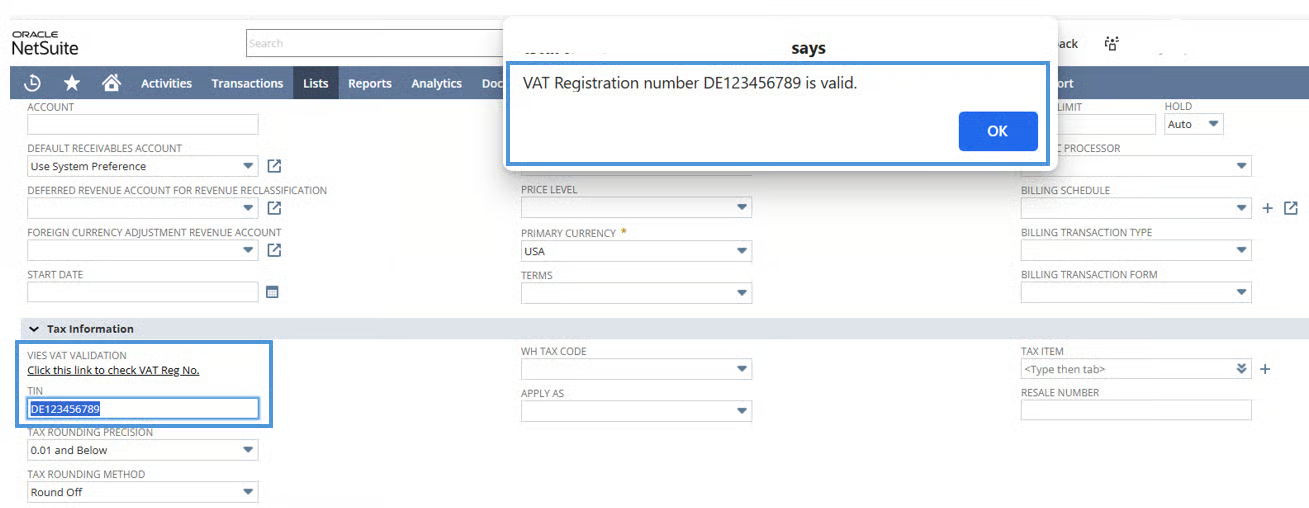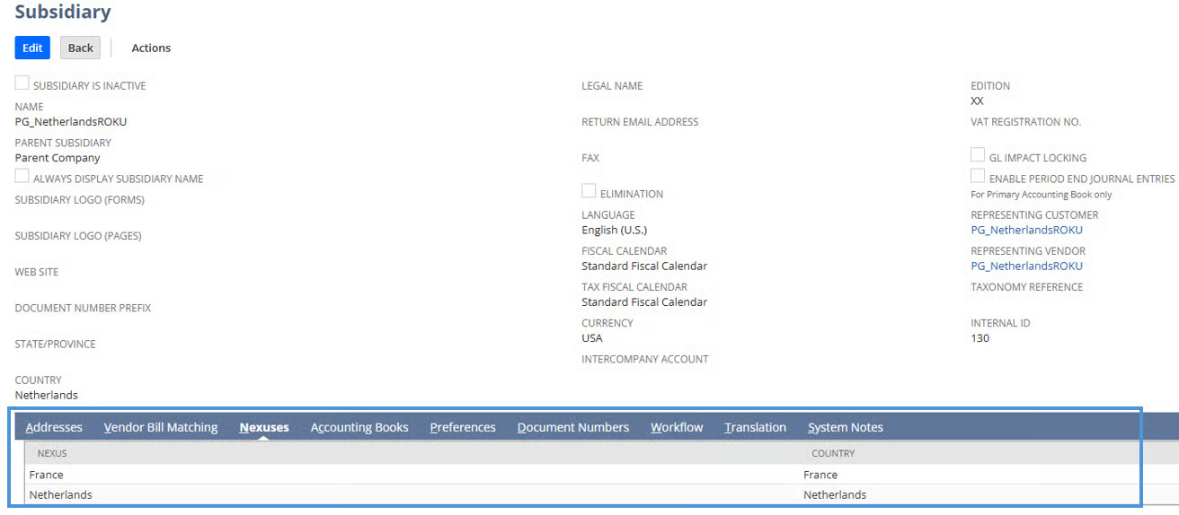 NetSuiteは、子会社ネクサス(オランダ)に関連付けられたECコードを検索します。選択した税金コードは、次のすべてを満たす必要があります。