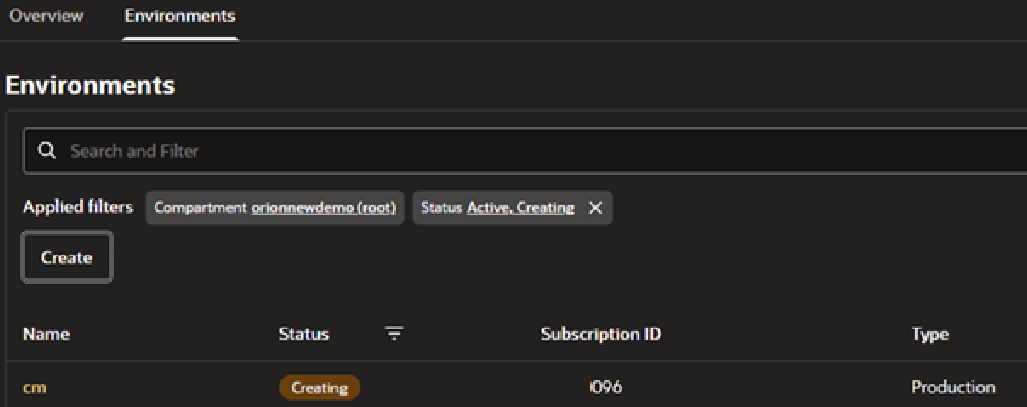 17 環境ページにリダイレクトされます。作成した本番/テスト環境が表示され、作成中ステータスになります。