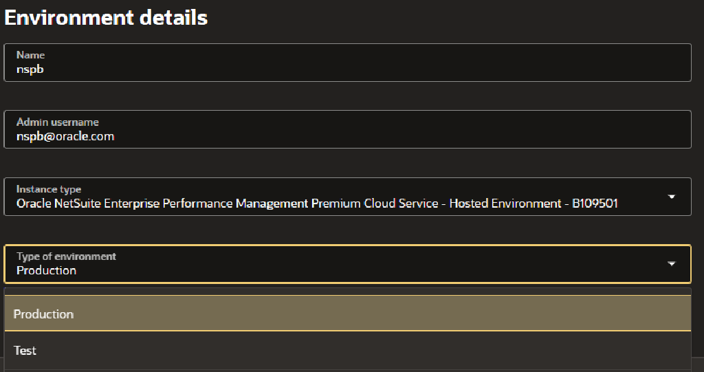 重要: NetSuite Planning and BudgetingおよびNetSuite Account Reconciliationの環境を作成する場合、常に「ホストされる環境」を選択します