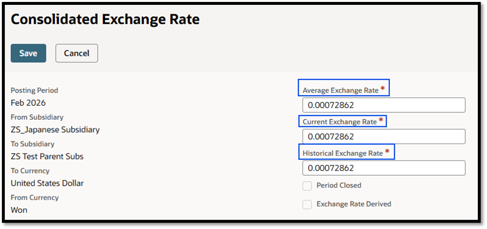 3. 連結為替レート・レコードで、「平均為替レート」、「現在の為替レート」および「履歴為替レート」を更新できます。