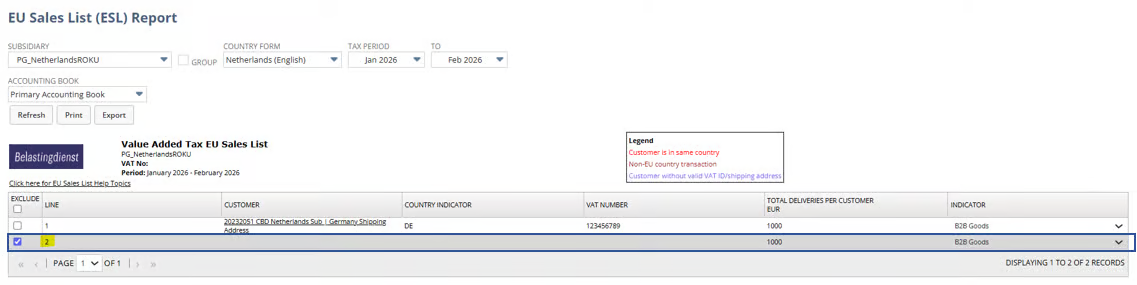 テストに基づいて、税の詳細が存在し、正しく入力されている限り、仕訳入力をEU販売リストに表示できます。