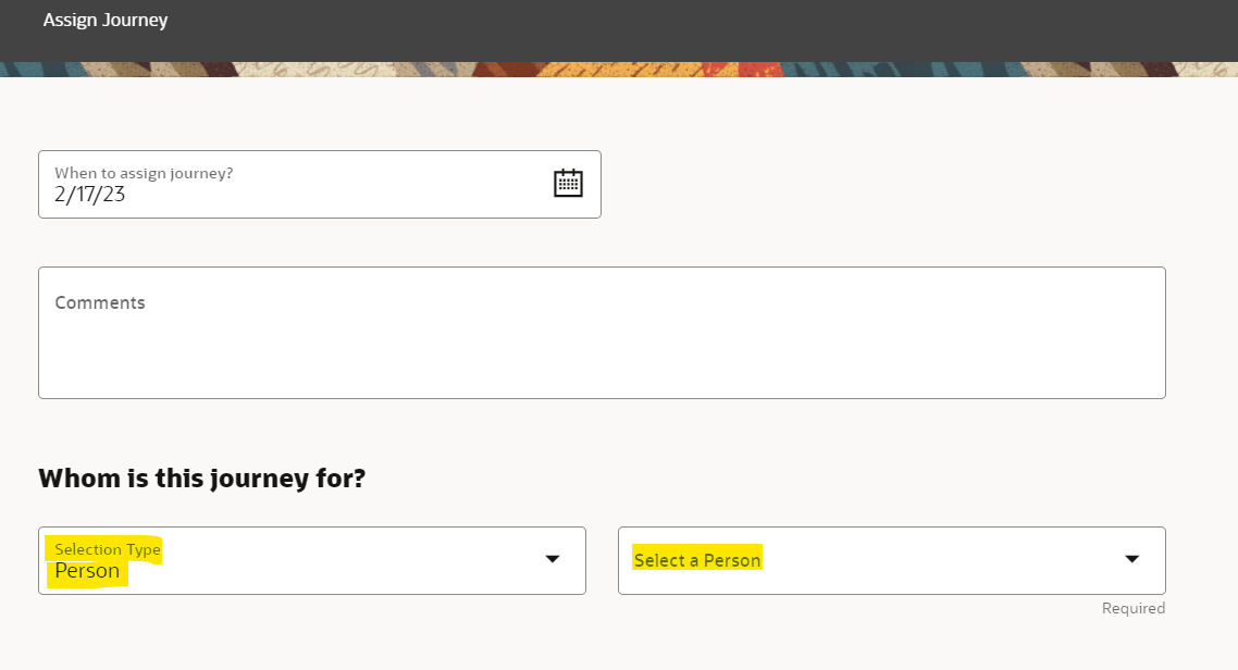 My Client Groups / Journeys tile / Explore tab / selecting specific journey / clicking "assign" button / using "Person" selection type / searching for individual in "Select a Person" field