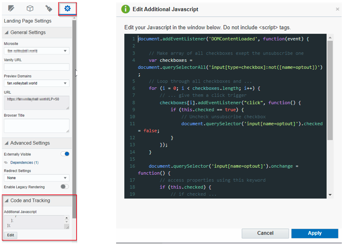 ランディング ページの [設定/コードとトラッキング] セクションに移動し、[追加の Javascript] の下にある [編集] をクリックします。