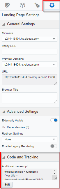 Eloquaランディング・ページにファビコン・イメージを追加するのは非常に簡単です! 実際、目的のランディング ページの [コードとトラッキング] 領域内の [ランディング ページ設定] に次の Javascript を追加するだけです。