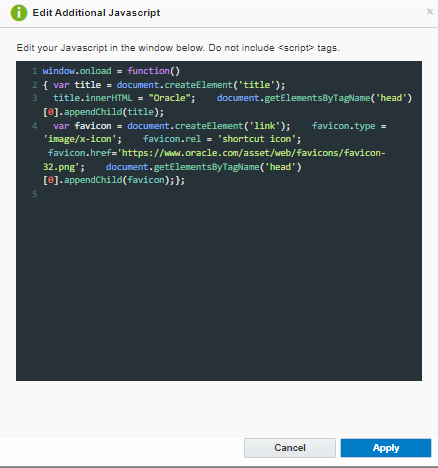 以下の Javascript を [Additional Javascript] セクションに追加し、ブランドまたはページ タイトルで更新して、目的のファビコンに URL を追加します。