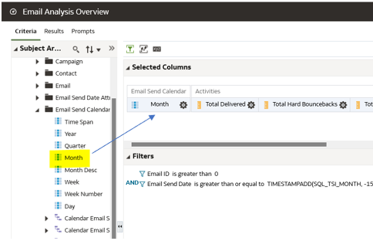 Eloqua Insight レポート「電子メール分析の概要」では、特定の期間に送信されたすべての電子メールの詳細が提供されます。デフォルトのプロンプトとフィルターを使用すると、時間範囲または特定の期間を選択したり、表示する電子メールを選択したり、電子メールを送信するユーザーを選択したりできます。