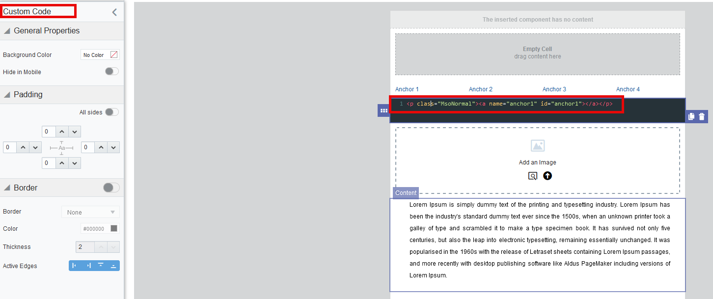 次に、アンカーをジャンプさせたい場所のすぐ上のメールにカスタム コード ブロックを追加し、カスタム HTML ブロックに次のコードを入力します。