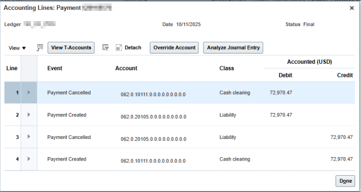 Currently, the Reversal Method of Manage Subledger Accounting Options> Payables is 'Change Sign'. Thus when payment voided, the payment cancelled accounting shown as negative amount entries.