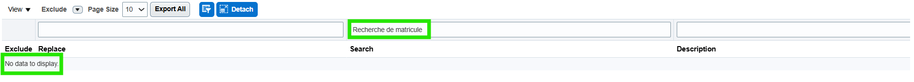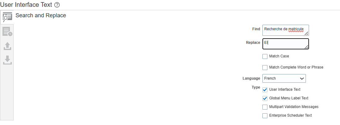 When I checked inside the Sandbox > User Interface Text and search for "Recherche de matricule", I didn't find the exact term or no results was shown.