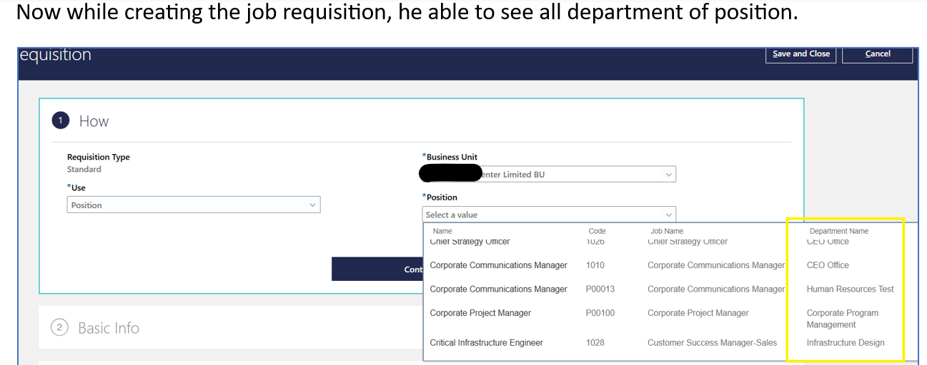 While crating job requestion hiring manager should only see the positions which are there under their department. could not see other department positions.