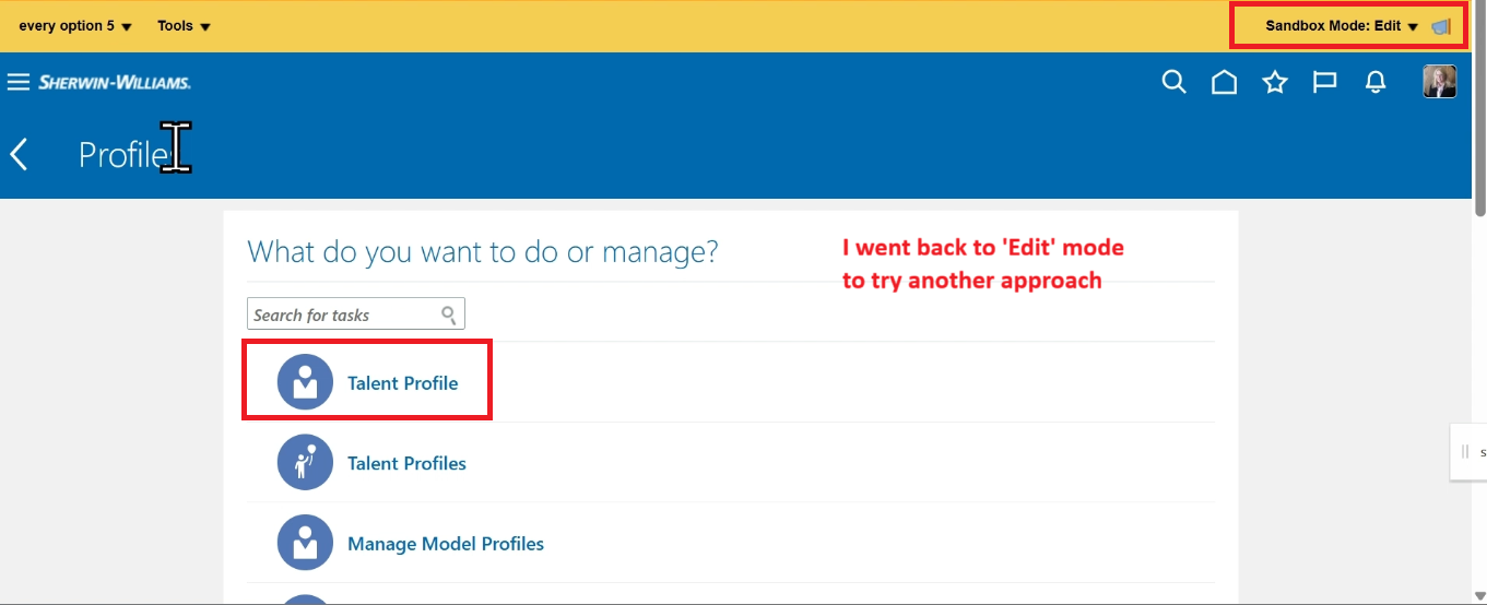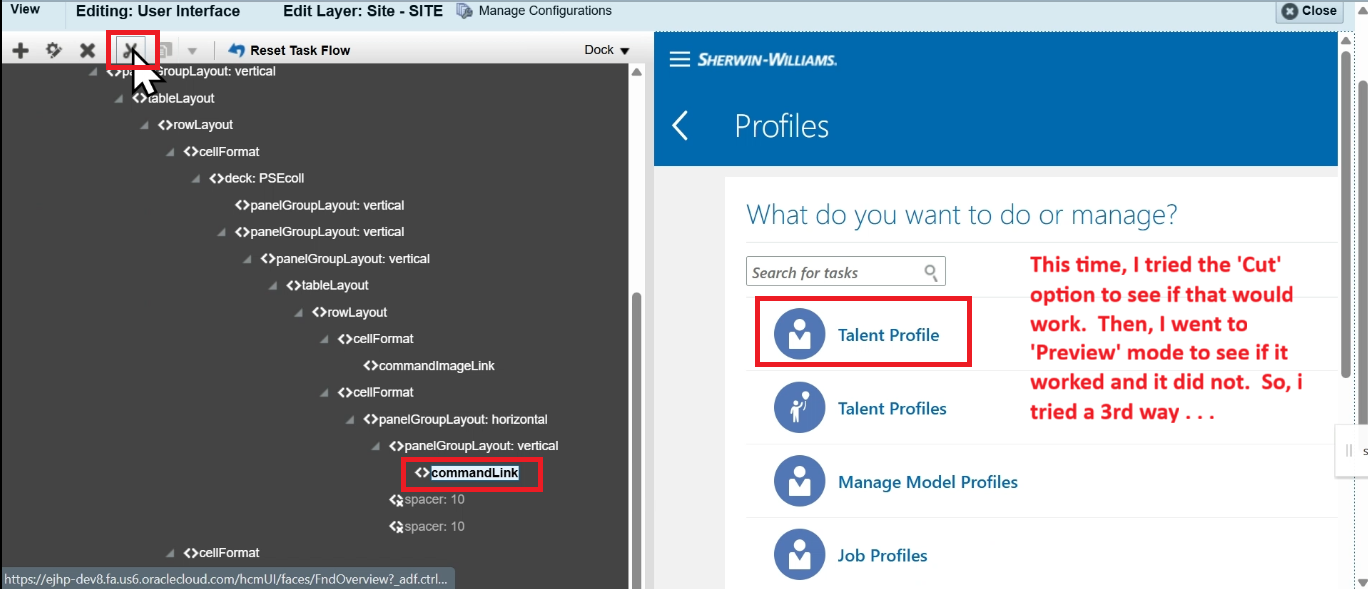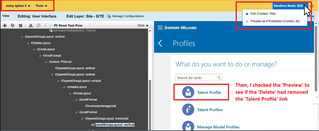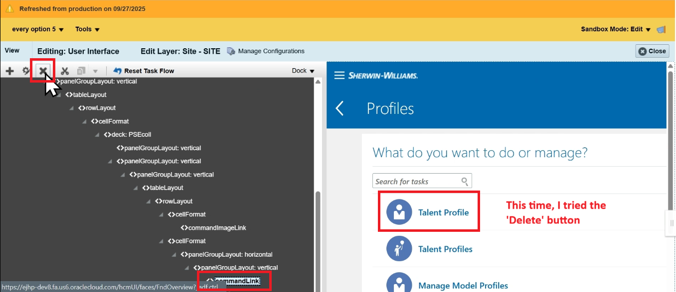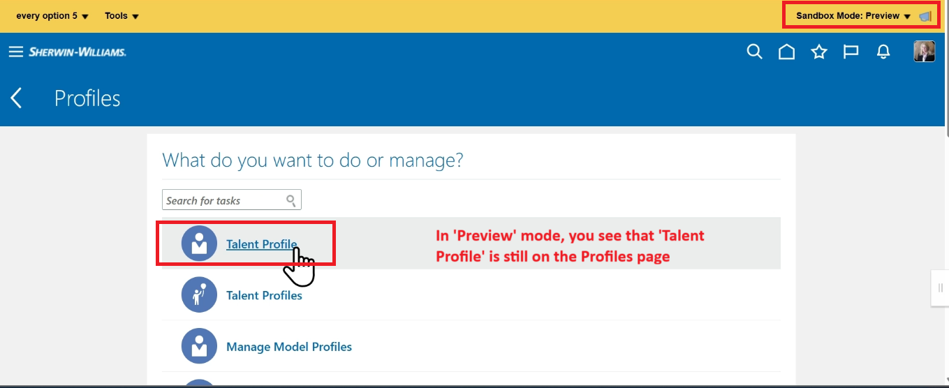 The "Talent Profile" & "Talent Profiles" are both showing on the 'Profiles' page. How do we remove the "Talent Profile" link? The method I used to remove other links in the sandbox are not working for this specific one. 'Talent Profile' is showing on this page and seems to be related to all the other links on this page. Please see the screenshots below here.