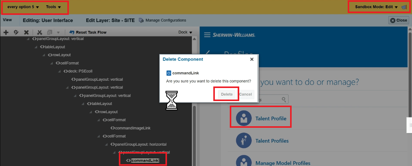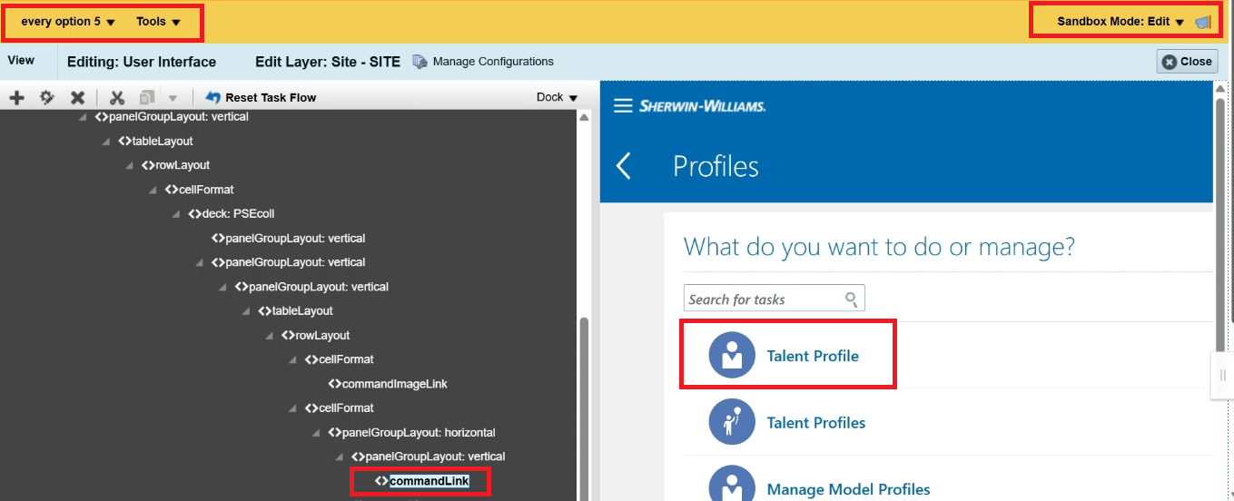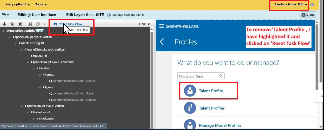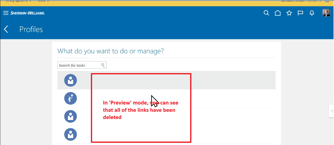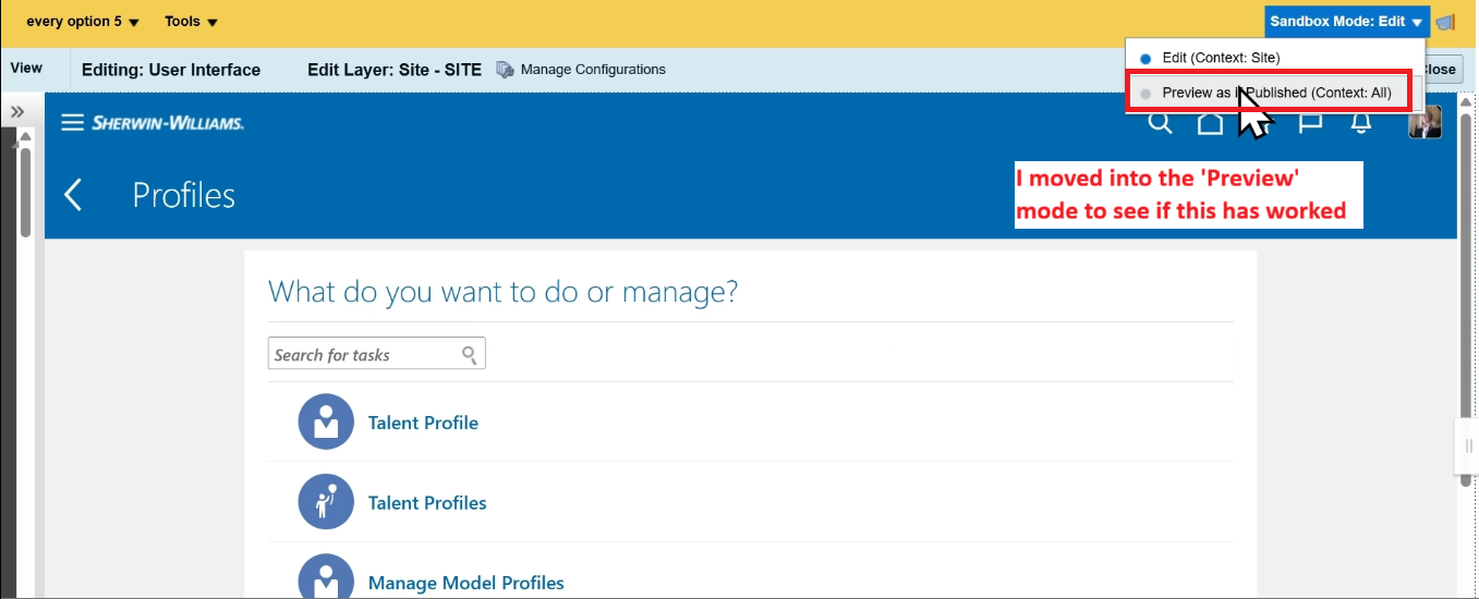 The "Talent Profile" & "Talent Profiles" are both showing on the 'Profiles' page. How do we remove the "Talent Profile" link? The method I used to remove other links in the sandbox are not working for this specific one. 'Talent Profile' is showing on this page and seems to be related to all the other links on this page. Please see the screenshots below here.