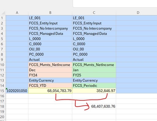 Step 1: YTD balances were loaded at Dec-FY24 using FCCS_Mvmts_NetIncome (see Col ‘BC’ in the screenshot).