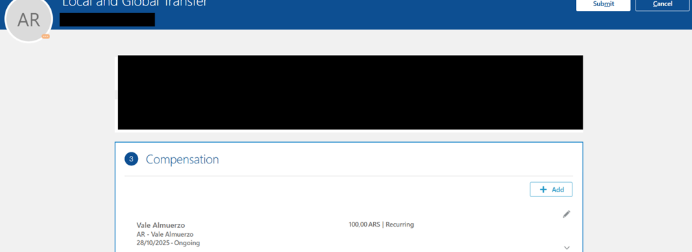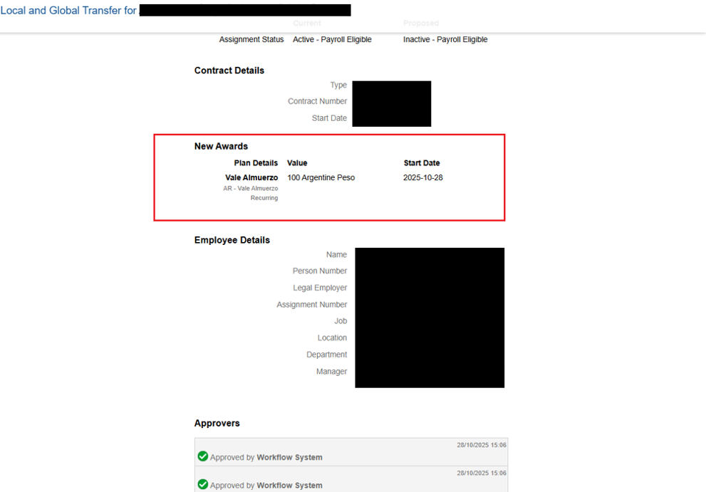 We've encountered an issue where the standard (seeded) post approval notification does not display compensation details when performing a global transfer via Redwood UI.