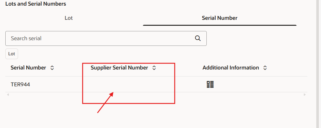 On manually entering supplier lot and supplier serial while receiving, when i check the transaction in the Completed inventory transactions in redwood, I am able to see supplier lot which i had entered, but supplier Serial is blank. Any input how we can get to see the supplier serial number