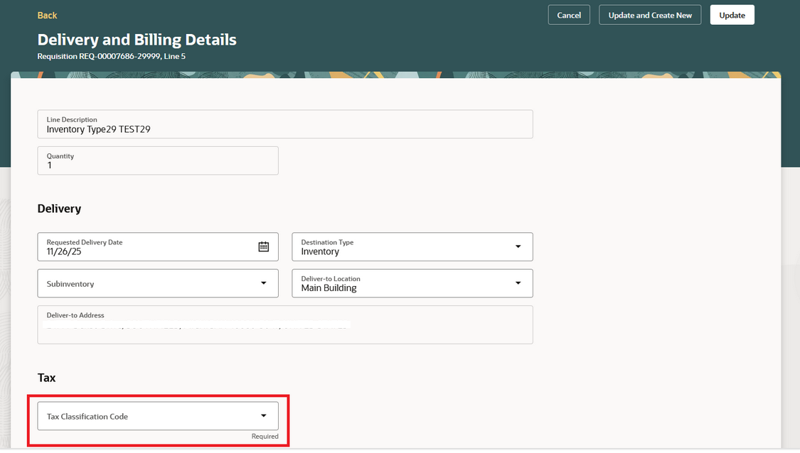 ・Destination Type/ Source Type = Expense/ Supplier → Tax Classification Code is defaulted.
