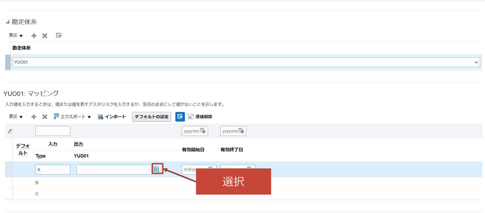 入力した値に応じてどのような勘定科目値の組み合わせ(出力値)を選択するかを入力します。